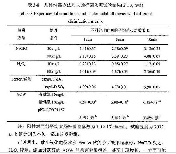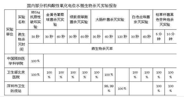 (1)概述:酸性氧化電位水是一種具有高氧化還原電位(ORP),低pH,含低濃度的有效氯的水,它是一種無色透明的液體,具有氯味,其氧化還原電位(ORP)大于或等于1100mV,pH值在2.7以下,有效氯含量一般為25 mg/L~50mg/L。它具有較強(qiáng)的氧化氯和快速殺滅微生物的作用,對(duì)各種微生物都有較強(qiáng)的殺滅作用。其具有殺菌速度快、安全可靠、不留殘毒、有利于環(huán)保等特點(diǎn)。