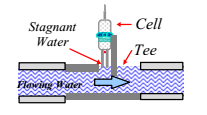 在傳統(tǒng)的棒狀電阻儀中,電阻池顯“T”型。如圖所示,水橫向流過,被測(cè)量電阻率的水則滯留在電阻池的“死角”中,這一區(qū)域?qū)⒆躺?xì)菌。