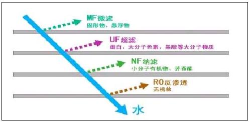 分離膜是具有選擇性分離功能的材料,利用膜的選擇性分離實(shí)現(xiàn)料液的不同組分的分離、純化、濃縮的過程稱作膜分離。它與傳統(tǒng)過濾的不同在于,膜可以在分子范圍內(nèi)進(jìn)行分離,并且這過程是一種物理過程,不需發(fā)生相的變化和添加助劑。膜的孔徑一般為微米級(jí),依據(jù)其孔徑的不同(或稱為截留分子量),可將膜分為微濾膜、超濾膜、納濾膜和反滲透膜,根據(jù)材料的不同,可分為無(wú)機(jī)膜和有機(jī)膜,無(wú)機(jī)膜主要是陶瓷膜和金屬膜,其過濾精度較低,選擇性較小。有機(jī)膜是由高分子材料做成的,如醋酸纖維素、芳香族聚酰胺、聚醚砜、聚氟聚合物等等。錯(cuò)流膜工藝中各種膜的分離與截留性能以膜的孔徑和截留分子量來加以區(qū)別,下圖簡(jiǎn)單示意了四種不同的膜分離過程:(箭頭反射表示該物質(zhì)無(wú)法透過膜而被截留):