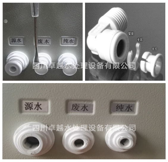 超純水機(jī)在出廠前都會(huì)用堵頭,堵著源水,廢水,純水三個(gè)接口。如圖所示:一、取出藍(lán)色卡環(huán),按住卡爪,使卡爪緊貼管座,然后拔出堵頭。如圖所示:二、在配件箱里找到藍(lán)色PE管,然后與不銹鋼三通接頭連接,并連接自來(lái)水。藍(lán)色PE管另一端連接到純水機(jī)源水接口即可。如圖所示:三、在配件箱里找到白色PE管,然后與不銹鋼桶球閥或(藍(lán)色桶球閥)連接(不同機(jī)型配不同壓力桶,自由選擇)。白色PE管另一端接到純水機(jī)純水接口即可。如圖所示:四、在配件箱里找到黑色PE管,然后連接到純水機(jī)廢水接口,黑色PE管的另一端直接放到排污口...