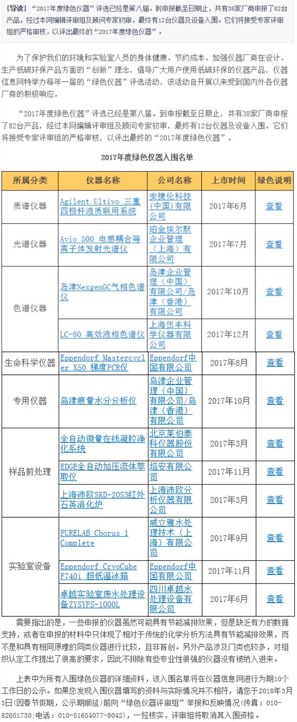 “2017年度綠色儀器”評選已經是第八屆。到申報截至日期止,共有38家廠商申報了82臺產品,經過本網編輯評審組及顧問專家初審,最終有12臺儀器及設備入圍。它們將接受專家評審組的嚴格審核,以評出最終的“2017年度綠色儀器”。
