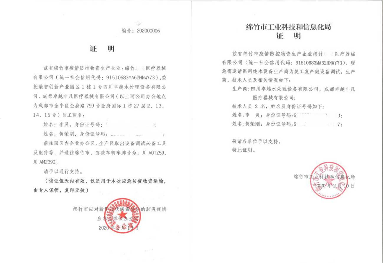 疫情就是命令,防控就是責(zé)任。卓越公司應(yīng)邀前往四川省綿竹市,為綿竹市疫情防控物資生產(chǎn)企業(yè)調(diào)試必備工具和配件等。在收到相關(guān)證明手續(xù)后,公司安排兩位經(jīng)驗(yàn)豐富的員工于2020年2月10日前往綿竹市。在抗?fàn)幰咔榈年P(guān)鍵時(shí)刻,肩負(fù)社會(huì)責(zé)任,爭(zhēng)做逆行者。