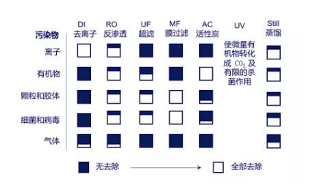 由上表我們可以看出,沒有一項(xiàng)純化技術(shù)能夠?qū)⒆詠硭械奈廴疚镔|(zhì)完全去除,所以想要得到比較純凈的水,需要結(jié)合多種純化技術(shù)來完成。
